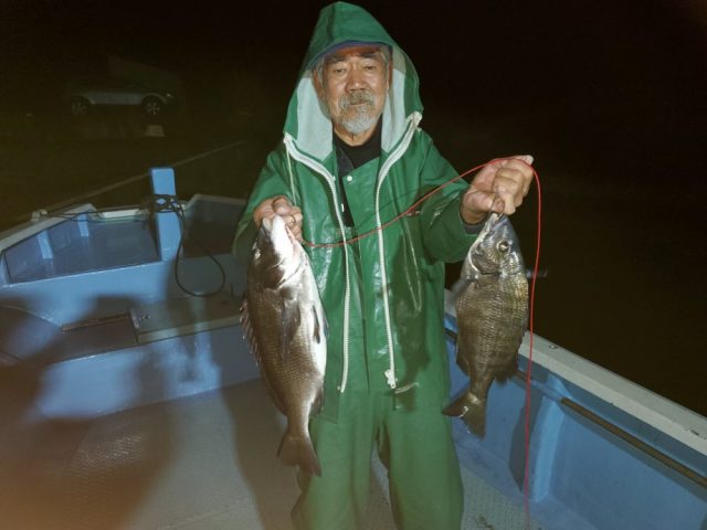 奈良の坂口さん ニラ浜の筏で チヌ39~42㎝2枚 エサ オキアミ